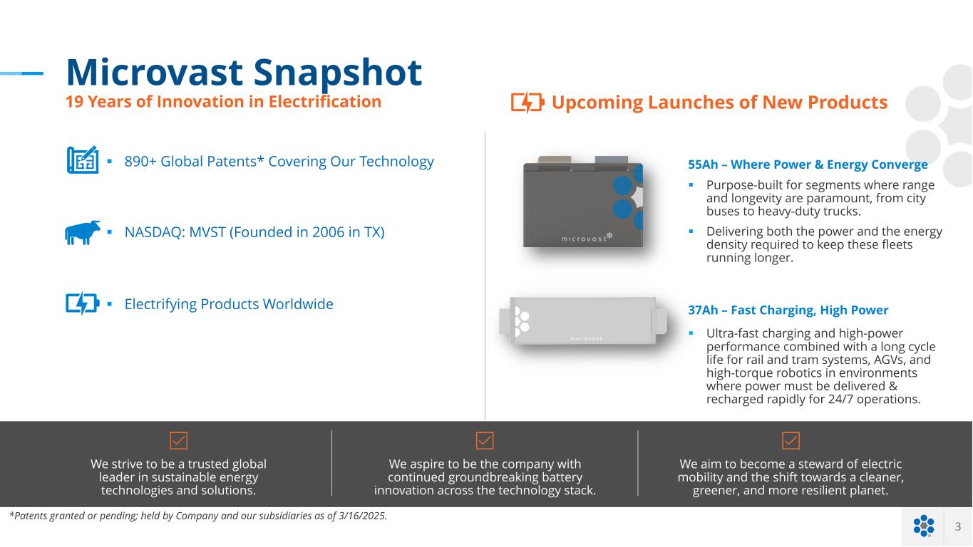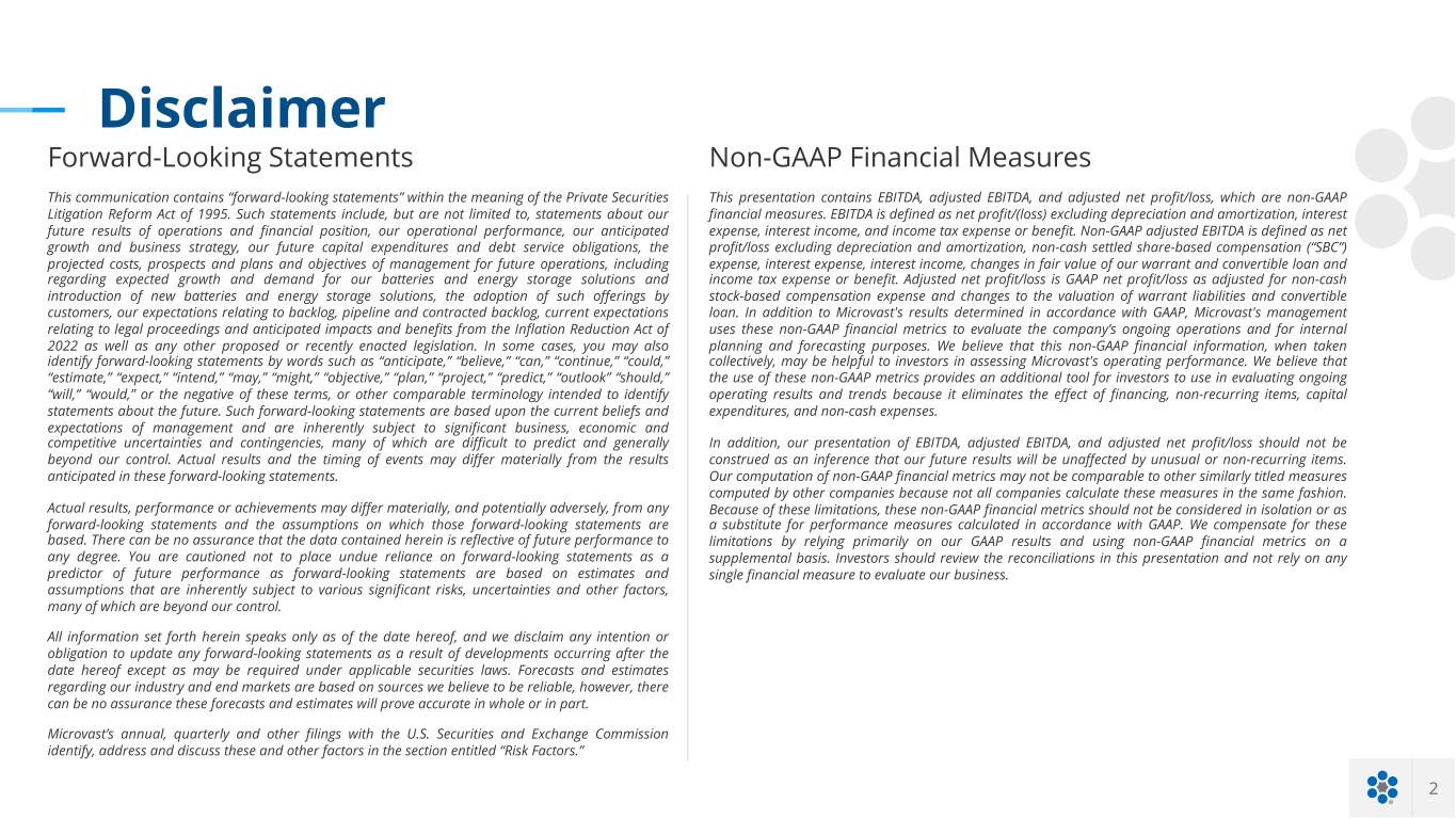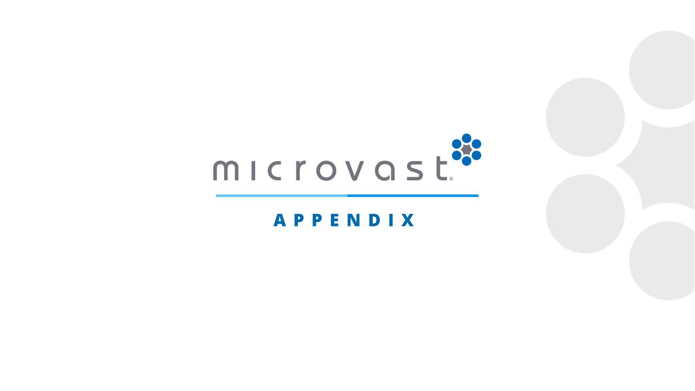 2 Disclaimer Forward-Looking Statements This communication contains “forward-looking statements” within the meaning of the Private Securities Litigation Reform Act of 1995. Such statements include, but are not limited to, statements about our future results of operations and financial position, our operational performance, our anticipated growth and business strategy, our future capital expenditures and debt service obligations, the projected costs, prospects and plans and objectives of management for future operations, including regarding expected growth and demand for our batteries and energy storage solutions and introduction of new batteries and energy storage solutions, the adoption of such offerings by customers, our expectations relating to backlog, pipeline and contracted backlog, current expectations relating to legal proceedings and anticipated impacts and benefits from the Inflation Reduction Act of 2022 as well as any other proposed or recently enacted legislation. In some cases, you may also identify forward-looking statements by words such as “anticipate,” “believe,” “can,” “continue,” “could,” “estimate,” “expect,” “intend,” “may,” “might,” “objective,” “plan,” “project,” “predict,” “outlook” “should,” “will,” “would,” or the negative of these terms, or other comparable terminology intended to identify statements about the future. Such forward-looking statements are based upon the current beliefs and expectations of management and are inherently subject to significant business, economic and competitive uncertainties and contingencies, many of which are difficult to predict and generally beyond our control. Actual results and the timing of events may differ materially from the results anticipated in these forward-looking statements. Actual results, performance or achievements may differ materially, and potentially adversely, from any forward-looking statements and the assumptions on which those forward-looking statements are based. There can be no assurance that the data contained herein is reflective of future performance to any degree. You are cautioned not to place undue reliance on forward-looking statements as a predictor of future performance as forward-looking statements are based on estimates and assumptions that are inherently subject to various significant risks, uncertainties and other factors, many of which are beyond our control. All information set forth herein speaks only as of the date hereof, and we disclaim any intention or obligation to update any forward-looking statements as a result of developments occurring after the date hereof except as may be required under applicable securities laws. Forecasts and estimates regarding our industry and end markets are based on sources we believe to be reliable, however, there can be no assurance these forecasts and estimates will prove accurate in whole or in part. Microvast’s annual, quarterly and other filings with the U.S. Securities and Exchange Commission identify, address and discuss these and other factors in the section entitled “Risk Factors.” Non-GAAP Financial Measures This presentation contains EBITDA, adjusted EBITDA, and adjusted net profit/loss, which are non-GAAP financial measures. EBITDA is defined as net profit/(loss) excluding depreciation and amortization, interest expense, interest income, and income tax expense or benefit. Non-GAAP adjusted EBITDA is defined as net profit/loss excluding depreciation and amortization, non-cash settled share-based compensation (“SBC”) expense, interest expense, interest income, changes in fair value of our warrant and convertible loan and income tax expense or benefit. Adjusted net profit/loss is GAAP net profit/loss as adjusted for non-cash stock-based compensation expense and changes to the valuation of warrant liabilities and convertible loan. In addition to Microvast's results determined in accordance with GAAP, Microvast's management uses these non-GAAP financial metrics to evaluate the company’s ongoing operations and for internal planning and forecasting purposes. We believe that this non-GAAP financial information, when taken collectively, may be helpful to investors in assessing Microvast's operating performance. We believe that the use of these non-GAAP metrics provides an additional tool for investors to use in evaluating ongoing operating results and trends because it eliminates the effect of financing, non-recurring items, capital expenditures, and non-cash expenses. In addition, our presentation of EBITDA, adjusted EBITDA, and adjusted net profit/loss should not be construed as an inference that our future results will be unaffected by unusual or non-recurring items. Our computation of non-GAAP financial metrics may not be comparable to other similarly titled measures computed by other companies because not all companies calculate these measures in the same fashion. Because of these limitations, these non-GAAP financial metrics should not be considered in isolation or as a substitute for performance measures calculated in accordance with GAAP. We compensate for these limitations by relying primarily on our GAAP results and using non-GAAP financial metrics on a supplemental basis. Investors should review the reconciliations in this presentation and not rely on any single financial measure to evaluate our business.