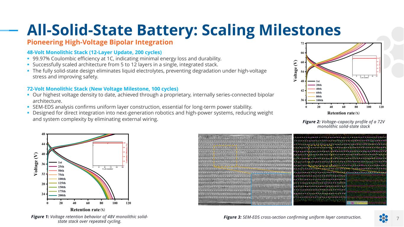 7 All-Solid-State Battery: Scaling Milestones Pioneering High-Voltage Bipolar Integration 48-Volt Monolithic Stack (12-Layer Update, 200 cycles) § 99.97% Coulombic efficiency at 1C, indicating minimal energy loss and durability. § Successfully scaled architecture from 5 to 12 layers in a single, integrated stack. § The fully solid-state design eliminates liquid electrolytes, preventing degradation under high-voltage stress and improving safety. 72-Volt Monolithic Stack (New Voltage Milestone, 100 cycles) § Our highest voltage density to date, achieved through a proprietary, internally series-connected bipolar architecture. § SEM-EDS analysis confirms uniform layer construction, essential for long-term power stability. § Designed for direct integration into next-generation robotics and high-power systems, reducing weight and system complexity by eliminating external wiring. Figure 1: Voltage retention behavior of 48V monolithic solid- state stack over repeated cycling. Figure 2: Voltage–capacity profile of a 72V monolithic solid-state stack Figure 3: SEM-EDS cross-section confirming uniform layer construction.
