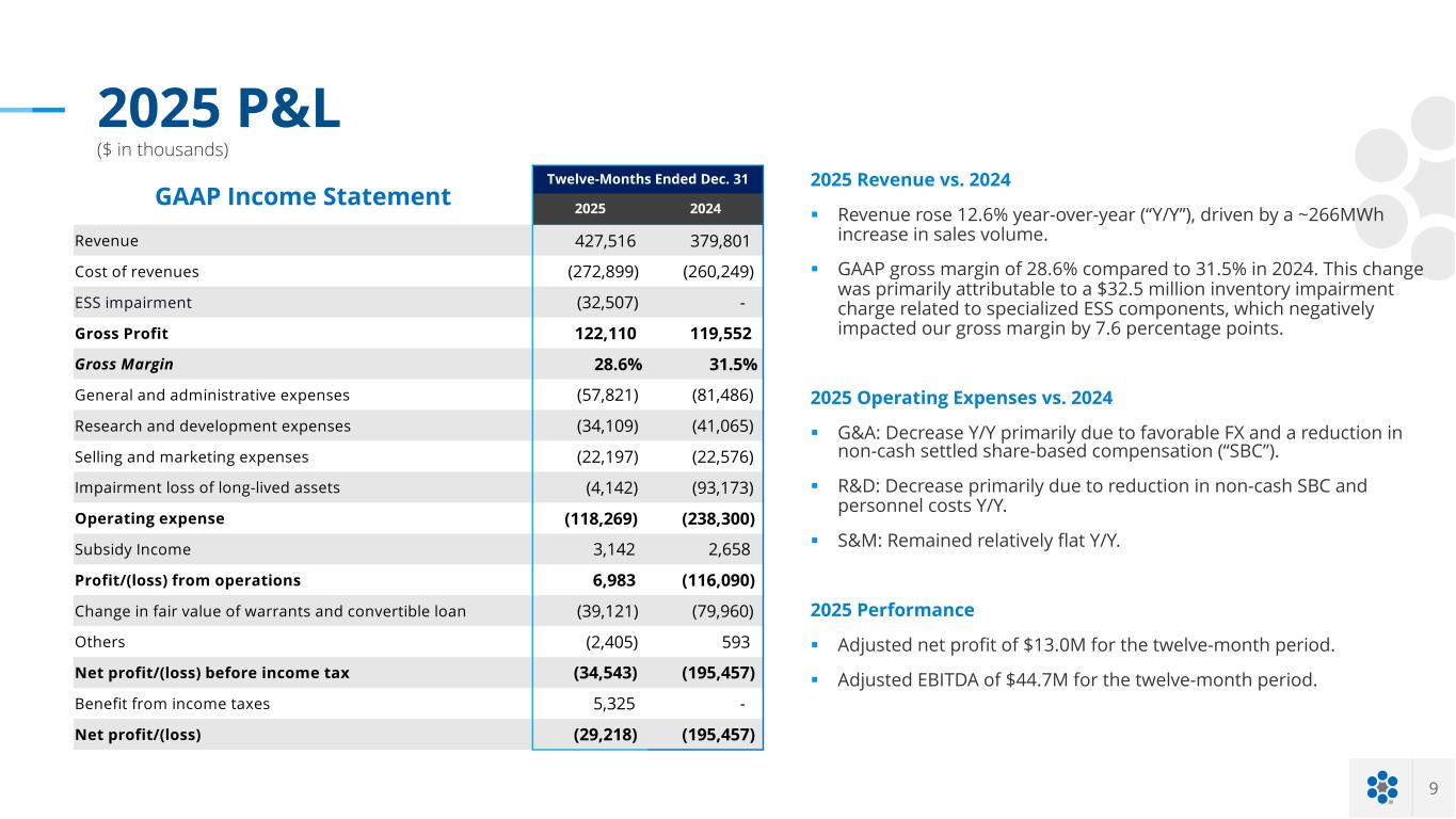 9 2025 P&L ($ in thousands) GAAP Income Statement Twelve-Months Ended Dec. 31 2025 2024 Revenue 427,516 379,801 Cost of revenues (272,899) (260,249) ESS impairment (32,507) - Gross Profit 122,110 119,552 Gross Margin 28.6% 31.5% General and administrative expenses (57,821) (81,486) Research and development expenses (34,109) (41,065) Selling and marketing expenses (22,197) (22,576) Impairment loss of long-lived assets (4,142) (93,173) Operating expense (118,269) (238,300) Subsidy Income 3,142 2,658 Profit/(loss) from operations 6,983 (116,090) Change in fair value of warrants and convertible loan (39,121) (79,960) Others (2,405) 593 Net profit/(loss) before income tax (34,543) (195,457) Benefit from income taxes 5,325 - Net profit/(loss) (29,218) (195,457) 2025 Revenue vs. 2024 § Revenue rose 12.6% year-over-year (“Y/Y”), driven by a ~266MWh increase in sales volume. § GAAP gross margin of 28.6% compared to 31.5% in 2024. This change was primarily attributable to a $32.5 million inventory impairment charge related to specialized ESS components, which negatively impacted our gross margin by 7.6 percentage points. 2025 Operating Expenses vs. 2024 § G&A: Decrease Y/Y primarily due to favorable FX and a reduction in non-cash settled share-based compensation (“SBC”). § R&D: Decrease primarily due to reduction in non-cash SBC and personnel costs Y/Y. § S&M: Remained relatively flat Y/Y. 2025 Performance § Adjusted net profit of $13.0M for the twelve-month period. § Adjusted EBITDA of $44.7M for the twelve-month period.