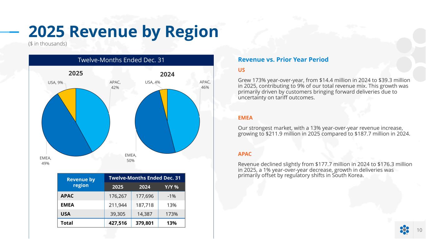 10 2025 Revenue by Region ($ in thousands) Revenue by region Twelve-Months Ended Dec. 31 2025 2024 Y/Y % APAC 176,267 177,696 -1% EMEA 211,944 187,718 13% USA 39,305 14,387 173% Total 427,516 379,801 13% Twelve-Months Ended Dec. 31 Revenue vs. Prior Year Period US Grew 173% year-over-year, from $14.4 million in 2024 to $39.3 million in 2025, contributing to 9% of our total revenue mix. This growth was primarily driven by customers bringing forward deliveries due to uncertainty on tariff outcomes. EMEA Our strongest market, with a 13% year-over-year revenue increase, growing to $211.9 million in 2025 compared to $187.7 million in 2024. APAC Revenue declined slightly from $177.7 million in 2024 to $176.3 million in 2025, a 1% year-over-year decrease, growth in deliveries was primarily offset by regulatory shifts in South Korea. APAC, 42% EMEA, 49% USA, 9% 2025 APAC, 46% EMEA, 50% USA, 4% 2024