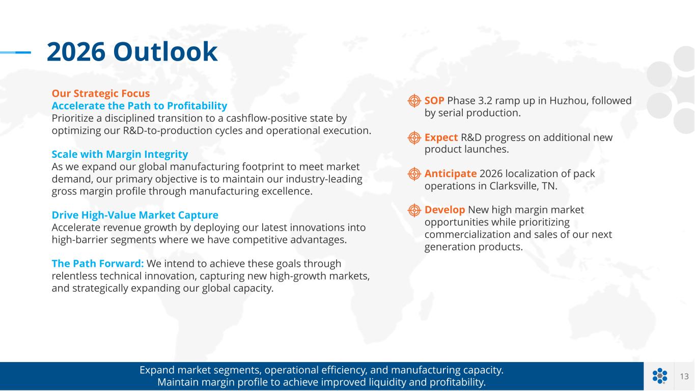 13 SOP Phase 3.2 ramp up in Huzhou, followed by serial production. Expect R&D progress on additional new product launches. Anticipate 2026 localization of pack operations in Clarksville, TN. Develop New high margin market opportunities while prioritizing commercialization and sales of our next generation products. Expand market segments, operational efficiency, and manufacturing capacity. Maintain margin profile to achieve improved liquidity and profitability. 2026 Outlook Our Strategic Focus Accelerate the Path to Profitability Prioritize a disciplined transition to a cashflow-positive state by optimizing our R&D-to-production cycles and operational execution. Scale with Margin Integrity As we expand our global manufacturing footprint to meet market demand, our primary objective is to maintain our industry-leading gross margin profile through manufacturing excellence. Drive High-Value Market Capture Accelerate revenue growth by deploying our latest innovations into high-barrier segments where we have competitive advantages. The Path Forward: We intend to achieve these goals through relentless technical innovation, capturing new high-growth markets, and strategically expanding our global capacity.