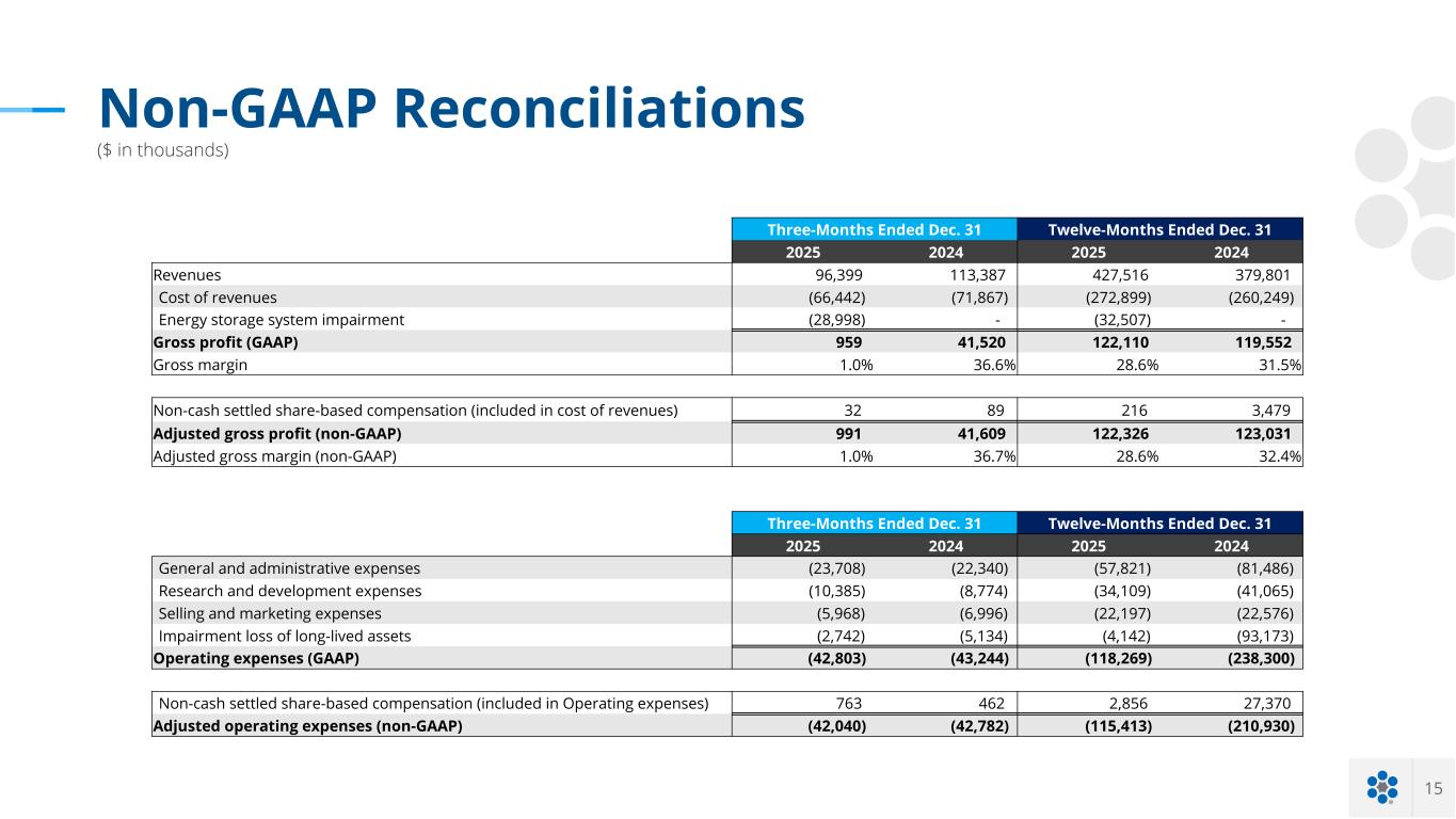 15 Non-GAAP Reconciliations ($ in thousands) Three-Months Ended Dec. 31 Twelve-Months Ended Dec. 31 2025 2024 2025 2024 Revenues 96,399 113,387 427,516 379,801 Cost of revenues (66,442) (71,867) (272,899) (260,249) Energy storage system impairment (28,998) - (32,507) - Gross profit (GAAP) 959 41,520 122,110 119,552 Gross margin 1.0% 36.6% 28.6% 31.5% Non-cash settled share-based compensation (included in cost of revenues) 32 89 216 3,479 Adjusted gross profit (non-GAAP) 991 41,609 122,326 123,031 Adjusted gross margin (non-GAAP) 1.0% 36.7% 28.6% 32.4% Three-Months Ended Dec. 31 Twelve-Months Ended Dec. 31 2025 2024 2025 2024 General and administrative expenses (23,708) (22,340) (57,821) (81,486) Research and development expenses (10,385) (8,774) (34,109) (41,065) Selling and marketing expenses (5,968) (6,996) (22,197) (22,576) Impairment loss of long-lived assets (2,742) (5,134) (4,142) (93,173) Operating expenses (GAAP) (42,803) (43,244) (118,269) (238,300) Non-cash settled share-based compensation (included in Operating expenses) 763 462 2,856 27,370 Adjusted operating expenses (non-GAAP) (42,040) (42,782) (115,413) (210,930)