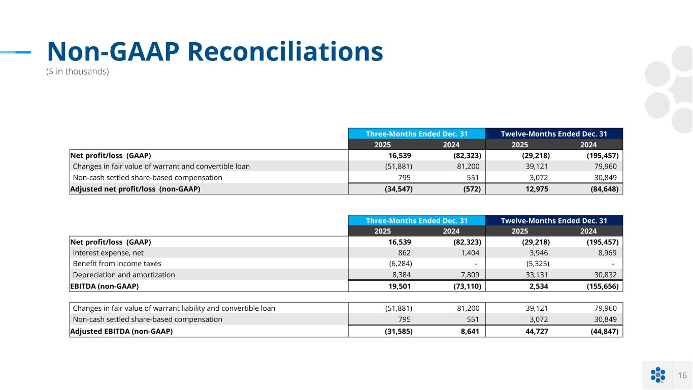 16 Non-GAAP Reconciliations ($ in thousands) Three-Months Ended Dec. 31 Twelve-Months Ended Dec. 31 2025 2024 2025 2024 Net profit/loss (GAAP) 16,539 (82,323) (29,218) (195,457) Changes in fair value of warrant and convertible loan (51,881) 81,200 39,121 79,960 Non-cash settled share-based compensation 795 551 3,072 30,849 Adjusted net profit/loss (non-GAAP) (34,547) (572) 12,975 (84,648) Three-Months Ended Dec. 31 Twelve-Months Ended Dec. 31 2025 2024 2025 2024 Net profit/loss (GAAP) 16,539 (82,323) (29,218) (195,457) Interest expense, net 862 1,404 3,946 8,969 Benefit from income taxes (6,284) - (5,325) - Depreciation and amortization 8,384 7,809 33,131 30,832 EBITDA (non-GAAP) 19,501 (73,110) 2,534 (155,656) Changes in fair value of warrant liability and convertible loan (51,881) 81,200 39,121 79,960 Non-cash settled share-based compensation 795 551 3,072 30,849 Adjusted EBITDA (non-GAAP) (31,585) 8,641 44,727 (44,847)